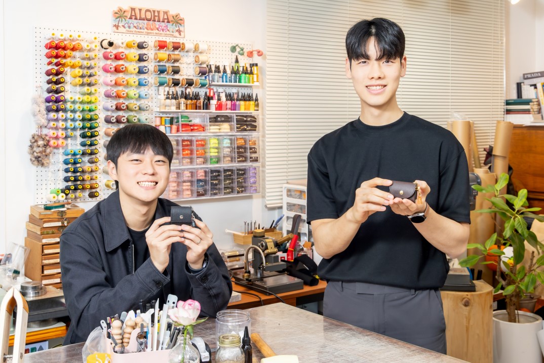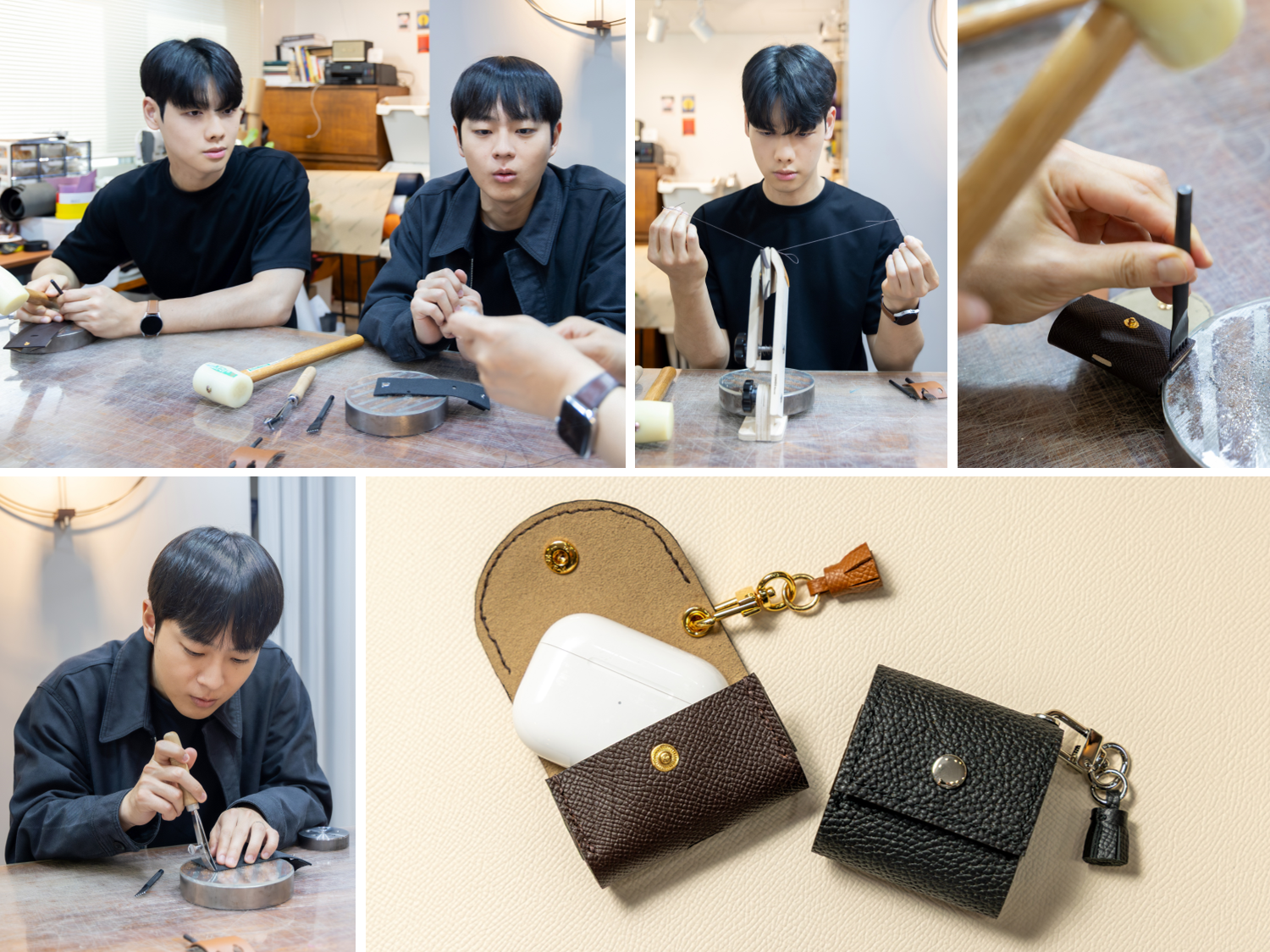 HD현대오일뱅크 공정기술2팀 김새찬 매니저와 전기설비팀 김일준 매니저가 자투리 가죽으로 근사한 이어폰 케이스를 만들었다.